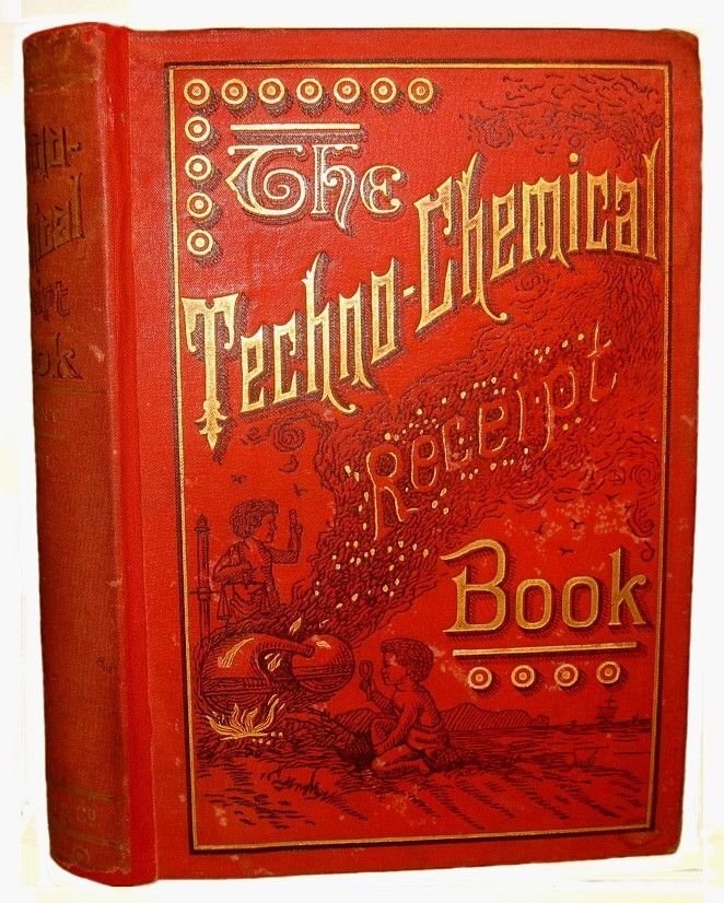 In researching late Victorian chemical tomes, I hit the jackpot at eBay: The Techno-Chemical Receipt Book: Containing Several Thousand Receipts, Covering the Latest, Most Important and Most Useful Discoveries in Chemical Technology, and their Practical Application in the Arts and the Industries, edited chiefly from the German of Drs. Winckler, Elsner, Heintze, Meirzinski, Jacobsen, Koller and Heinserling, with additions by William T. Brannt, Graduate of the Royal Agricultural College of Eldena, Prussia, and William H. Wahl, Ph.D. (Heid.), Secretary of the Franklin Institute, Philadelphia; author of “Galvanoplastic Manipulations,” illustrated by seventy-eight engravings, Henry Carey Baird & Co., 1890.