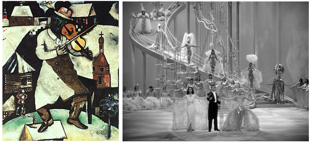 Left, The Fiddler by Marc Chagall, 1912, an inspiration for the Broadway musical Fiddler on the Roof. Right, a characteristic setting by Joseph Urban for the Ziegfeld Follies.
