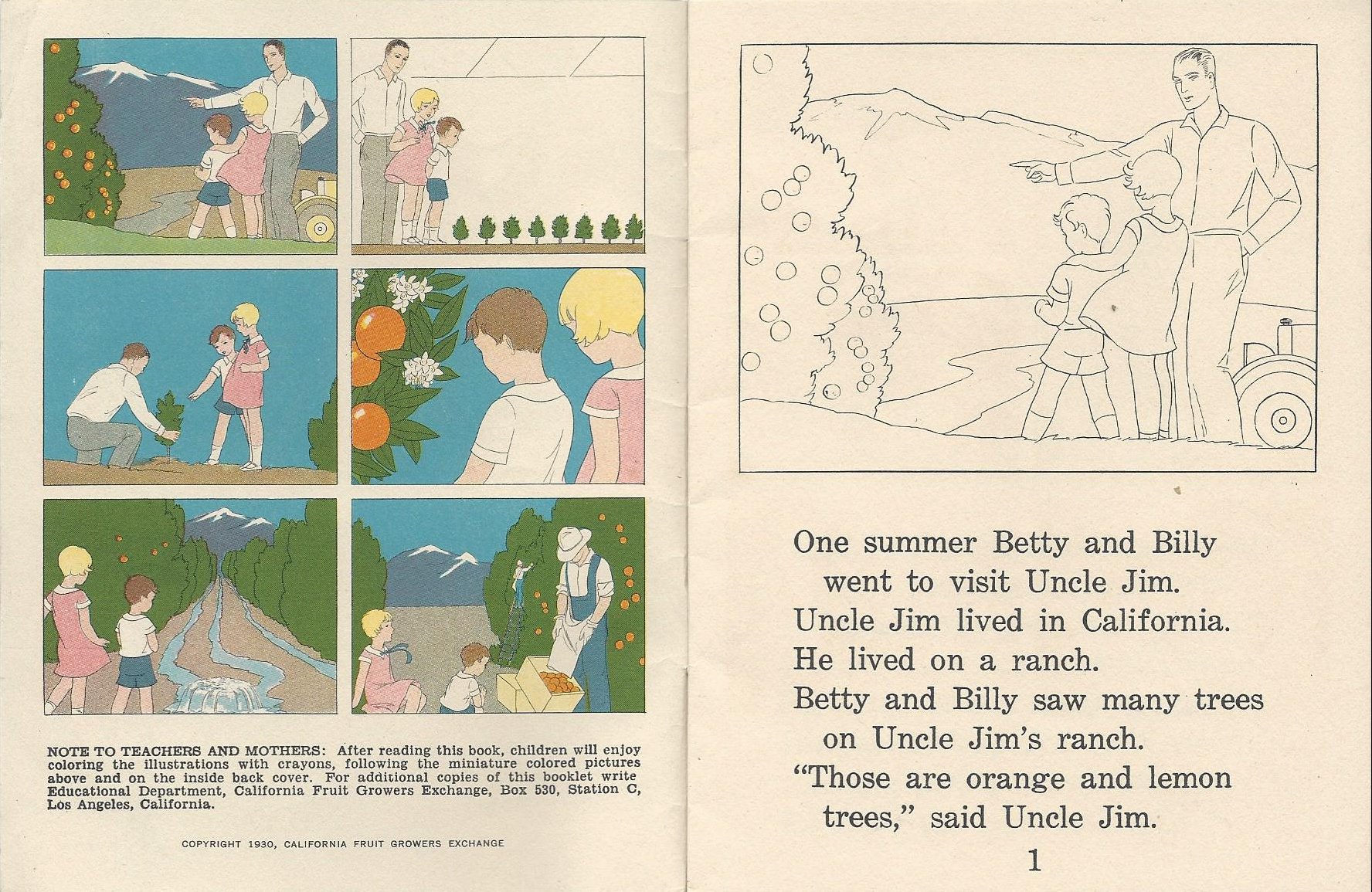 The story tells of Betty and Billy visiting their Uncle Jim, who lives on a ranch in California. “Betty and Billy saw many trees on Uncle Jim’s ranch. ‘Those are orange and lemon trees,’ said Uncle Jim.”