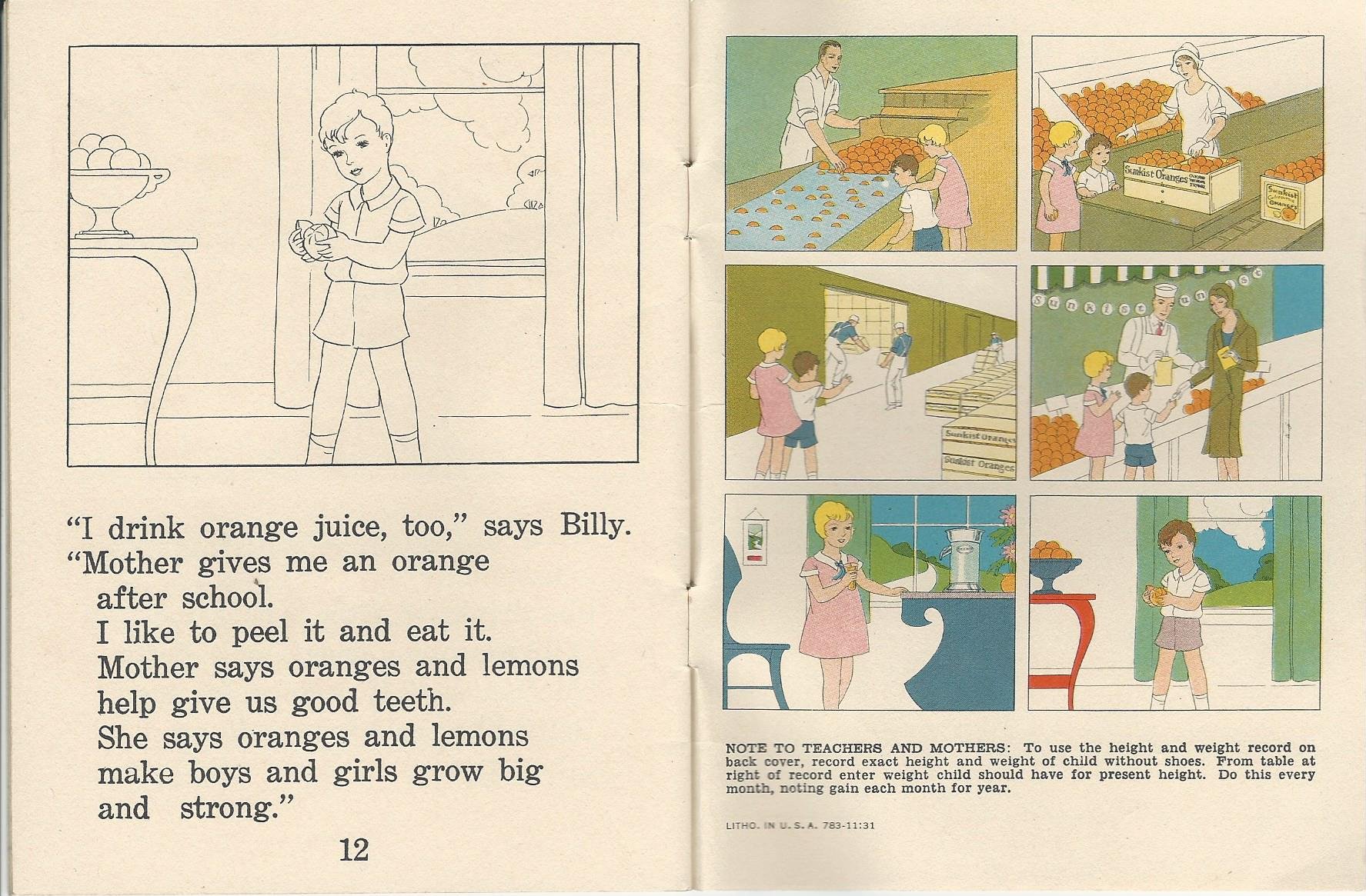 Not exactly “Wow! Zonks! Bam!” But a damnsight more compelling than “See Dick. See Jane. Run, Dick, run. Run, Jane, run,” the sort of thing I was exposed to in pre-phonics reading instruction. And, in fact, the Land of Oranges kids learn about planting orange trees, the importance of sunshine and water in the trees’ nurturing, and even the distribution network that brings the fruit into homes.
