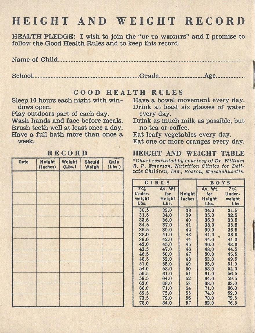 Back to The Land of Oranges. The book’s rear cover has a “Height and Weight Record” that is a telling commentary on the times. Its Health Pledge read, “I wish to join the ‘Up to Weights’ and I promise to follow the Good Health Rules and keep this record.” The rules provide few surprises to today’s readers, though there are some quirks of the era: Sleep “with windows open.” “Have a full bath more than once a week.”