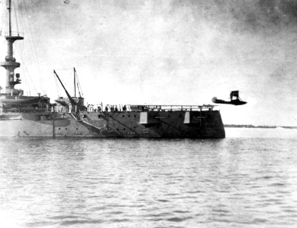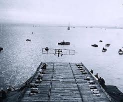 Naval officer Theodore Ellyson had his flight training at Glenn Curtiss’s North Island, San Diego, facility. He earned the distinction of being U.S. Navy Air Pilot No. 1, and Naval Aviator No. 1 as well (oddly, two different classifications). His first attempt with a compressed-air catapult off an Annapolis Santee Dock put him and his craft in the drink. On Nov 12, 1912, Ellyson successfully catapulted into the air from a moored coal barge.