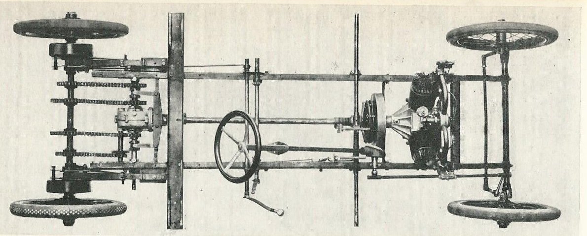 G.N. chassis, 1920. Gone is the wire-and-bobbin steering; the chain drive remains, now with three speeds and reverse.