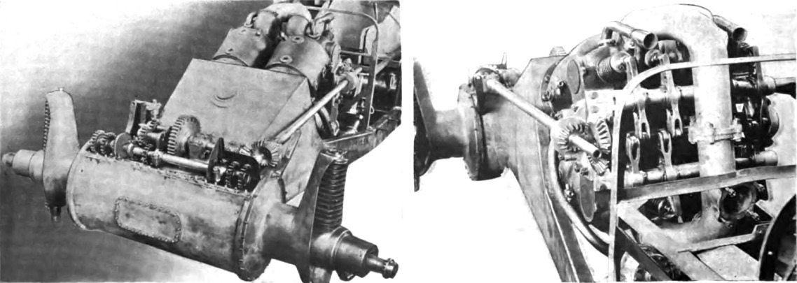 A two-speed gearbox, plus reverse, resided within the engine’s crankcase. The direct drive was “high speed.” For the others, a spur gear off the crankshaft drove a parallel auxiliary shaft and cross shaft. Sliding the cross shaft laterally decoupled the crankshaft from the drive wheels and engaged either “low speed” or reverse.
