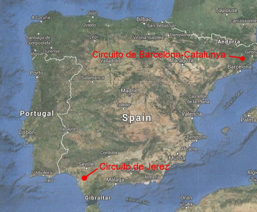 Two traditional F1 winter testing venues in Spain. Jerez has been dropped for 2016. This and other maps from Google.