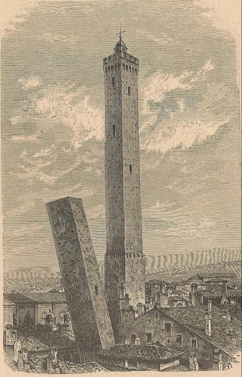 I recognize the Leaning Tower of Pisa, said to be where Galileo Galilei demonstrated that the descent of falling objects is independent of their mass. However, I learned of the Leaning Towers of Bologna from Gourdault’s book. The taller one is Torre Asinelli; the more dramatically askew one is Torre Garisenda. Dante mentioned the latter in his Divine Comedy.