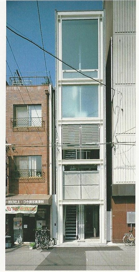 Architect Waro Kishi had only an 8-ft. frontage for a “pencil” dwelling in Osaka, Japan. On the other hand, its 42-ft. depth and four upper floors, the top one with a 20-ft. ceiling, give tidy urban accommodation with an open-air roof garden.
