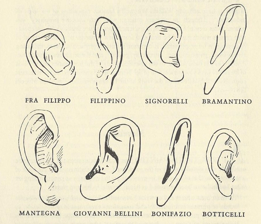 Above, ears as typically portrayed by famous artists, according to Morelli. Below, Botticelli hands, per Morelli. Images from Sherlock Holmes and Dr Freud.