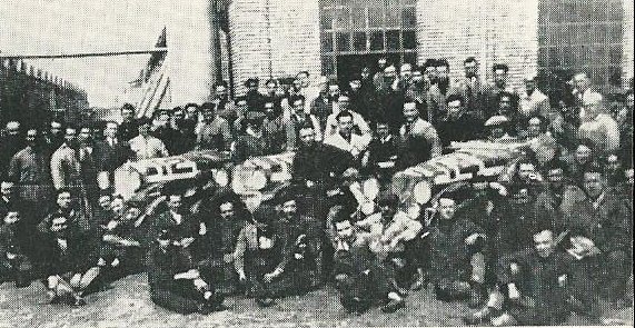 O.M.’s Ferdinando Minoia and Giuseppe Morandi check in at Rome, halfway to their 1927 Mille Miglia victory. Below, jubilation at the works following the win.