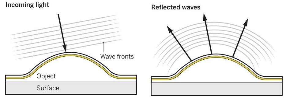 Instead of diverting light around an object, Xiang Zhang and his team work to modify the reflected light. Cho’s summary offers an example with a bump on a surface. Ordinarily, light waves bouncing off the bump give away its presence.