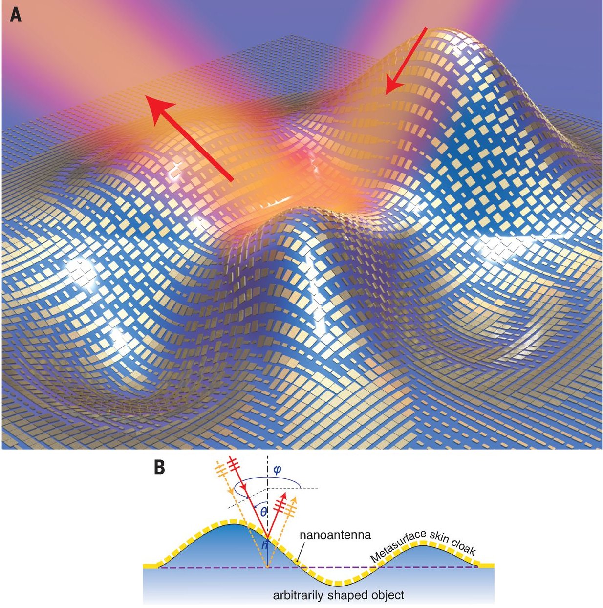 A: a 3D illustration of a metasurface skin cloak. B: Its nanoantennas modify reflections, now corresponding to the flat surface, not the bump.