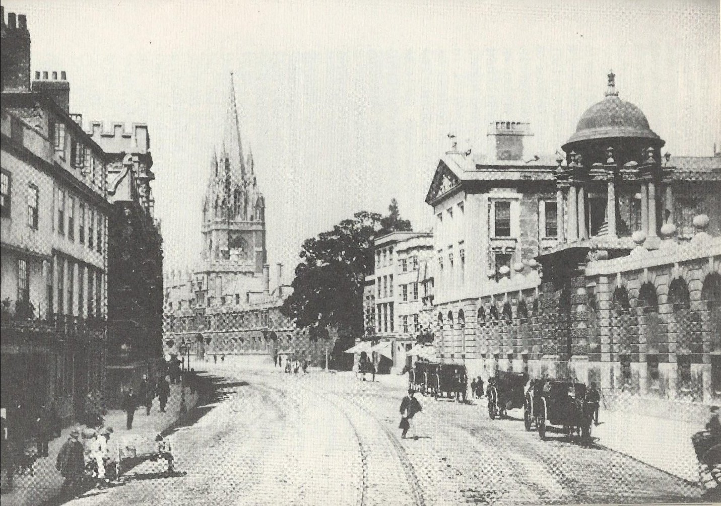 High Street, Oxford, c. 1885, with University College and Logic Lane on the left. Note the dog in the bottom left corner. Image from Sherlock Holmes at Oxford.
