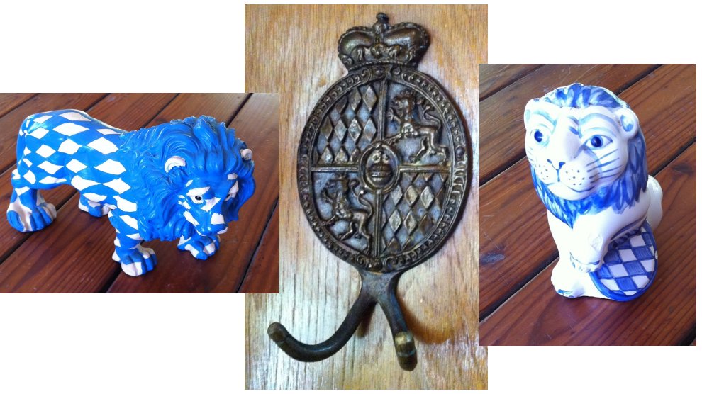 Bavaria’s coat of arms has two large gold lions supporting a shield of five elements. This shield is quartered with a smaller gold lion, three black lions, a red and white Franconia Rake, and a blue panther. Within the shield is a smaller shield of blue and white diamonds, the colors of the Bavarian flag.