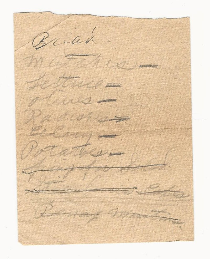 My copy of the book also contained a separate scrap of paper containing a shopping list: bread, matches, lettuce, olives, radishes, celery, potatoes. I note pointedly this list was written en clair, not in shorthand.