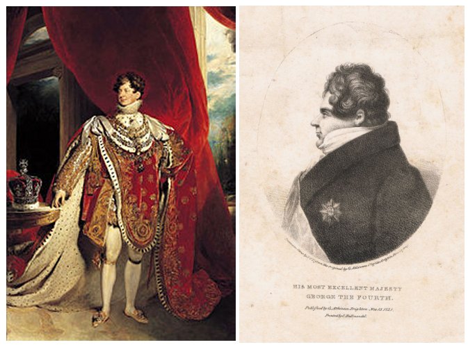 At left, George IV, coronation portrait by Sir Thomas Lawrence, 1821. At right, George IV, lithograph by George Atkinson, 1821. (You pays your money, you takes….)