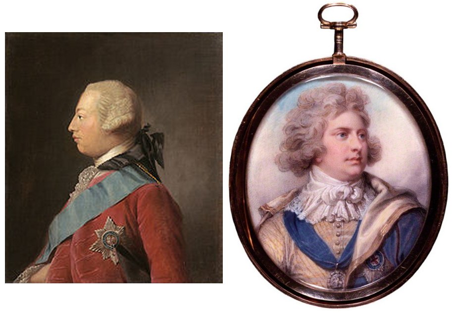 At left, King George III, 1738 – 1820, portrait by Allan Ramsey, 1762. At right, his son, George, Prince of Wales, 1762 – 1830, miniature by Richard Cosway, 1792.