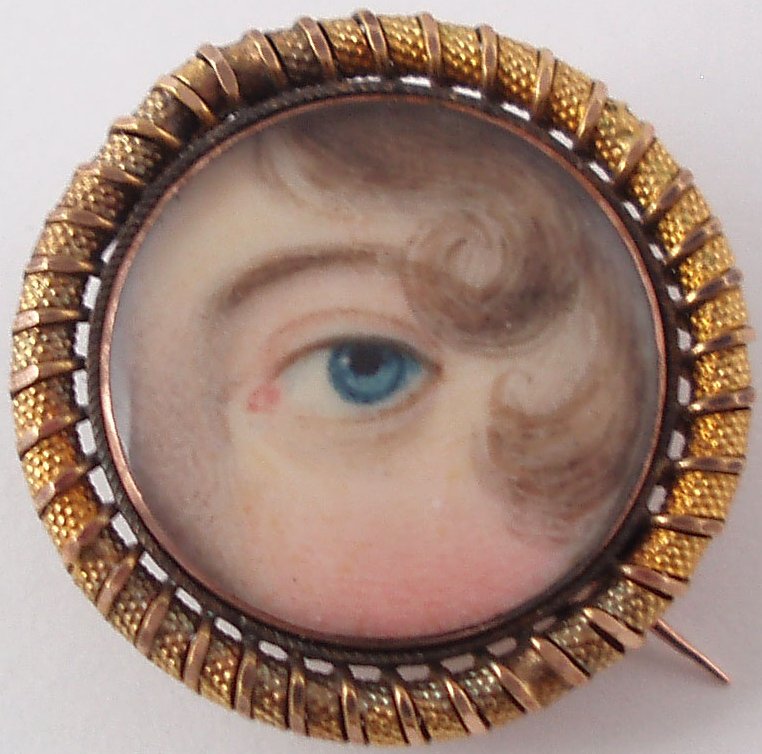 A “lover’s eye,” an eye miniature, diameter approximately 1 in. This one hand painted on ivory, c. 1800. Image from Imageevent.com.
