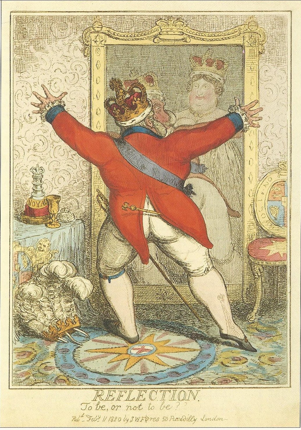 This image of George’s quandary was published three days before his father’s funeral. George has swapped his coronet and Prince of Wales three feathers for the crown, looks in a mirror, sees his royal reflection—and a crowned Caroline. Bloody heck.