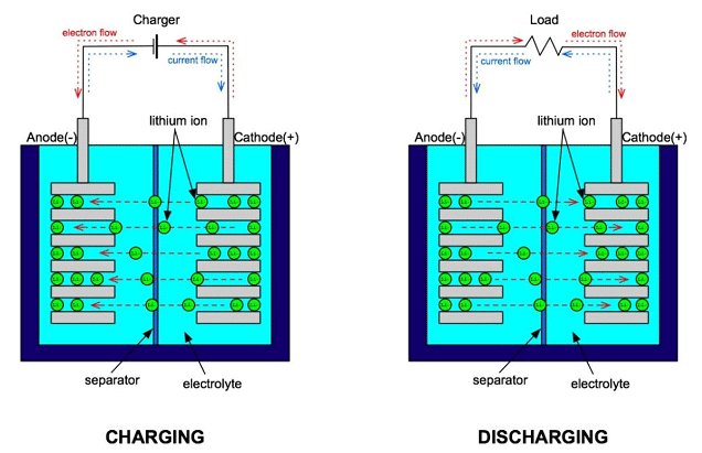 Lithium-air battery charge and discharge cycles. We know the electron travel, the e _ movement, as electric current. Image by Na9234.