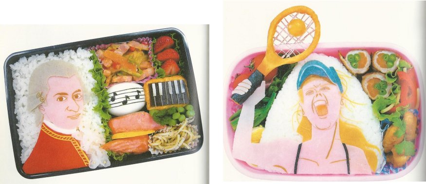 Part of the fun is guessing the food used. (Is that hairdo really sliced mushroom?) Also, the book was an excellent puzzle for translating Japanese Katakana characters: mo-so-a-ru-to, shi-ya-ra-po-va.