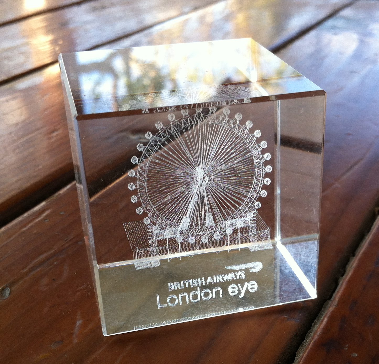 My principal souvenir of the London Eye goes by various names, the least elegant, a bubblegram. A product of laser technology, this crystal cube has an artful three-dimensional etching of the British Airways London Eye, as it was known at the time of my visit.
