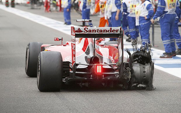 Sebastian Vittel’s Ferrari after its blowout, Belgian Grand Prix, 2015. Image from The Telegraph.