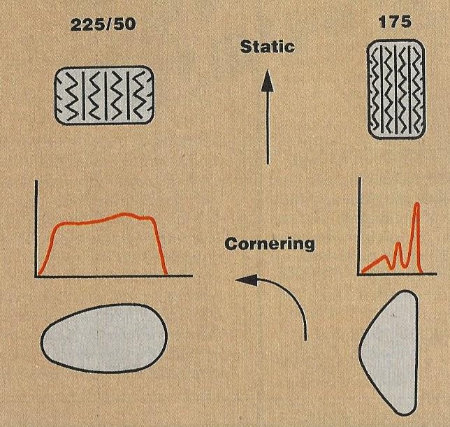 Comparing compact patches of the wimpy 175/75R-13 with a wider 225/50R-15, both having approximately the same diameter. Image from R&T, February 1986.