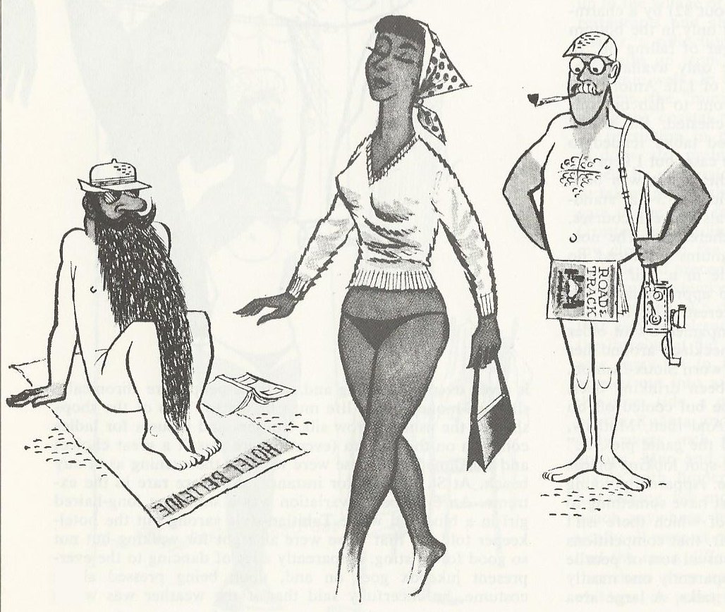 Edited; memory jogged by Dave W. The bearded guy at left is famed Brit journalist (and Stirling Moss co-driver) Denis Jenkinson. The fellow at right in the R&T is Henry, on assignment for “The Incompleat Guide to the Ile du Levant,” R&T, March 1964. Illustration by Brockbank.
