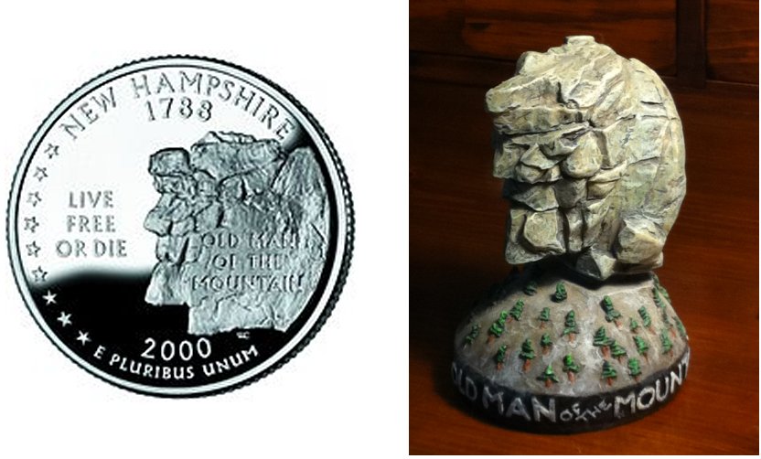 The Old Man of the Mountain was there long before and after the Profile House: First identified in 1805, this touristic attraction for the imaginative collapsed on May 3, 2003. Today, its best view is on the reverse of the New Hampshire quarter.