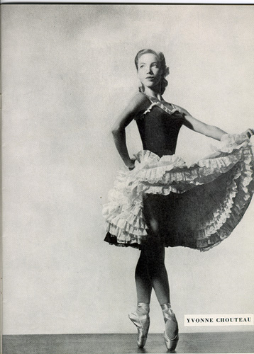 Chouteau’s first solo with the Ballet Russe de Monte Carlo was in a 1945 production of Leo Delibes’ Coppélia. Major roles followed, about which British dance critic P.W. Manchester wrote, “Although she is tall and strongly built, she is very light and brings an ecstatic quality to her dancing.”