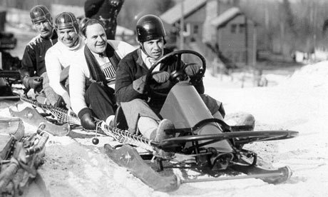 An Olympic four-man bobsleigh, Lake Placid. 1932. From front to back, Americans Billy Fiske, Clifford Gray, Eddie Eagan and Jay O’Brien. Image from theguardian.com.