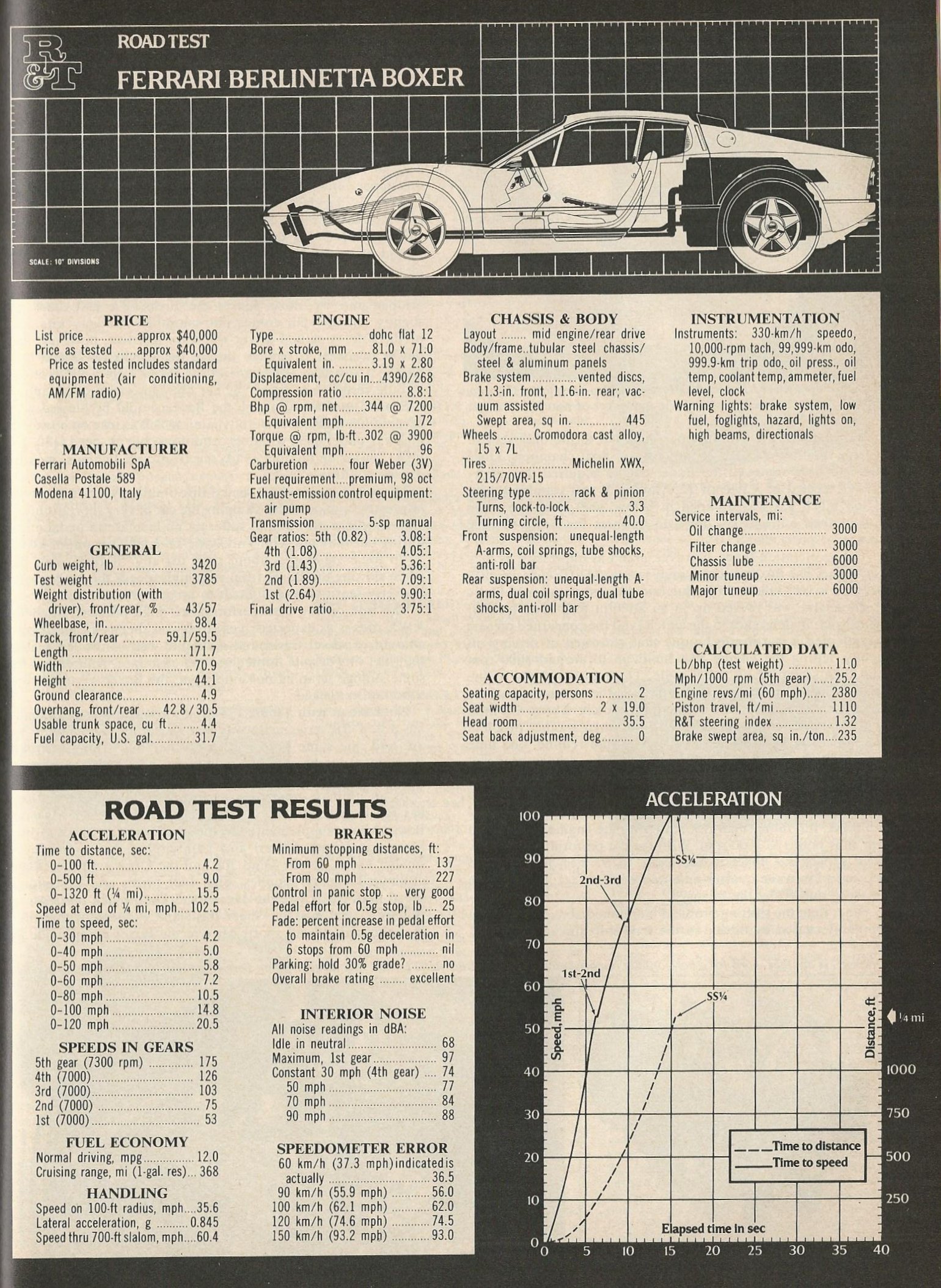 Some background: Speed x time = distance. For example, go 40 mph for two hours and the distance traveled is 80 miles. But what if the speed changes, say, with acceleration from a standstill to 100 mph? This is where calculus, the mathematics of change, is useful. Here’s an example of changing speed, from the June 1975 R&T road test of a Ferrari Berlinetta Boxer.