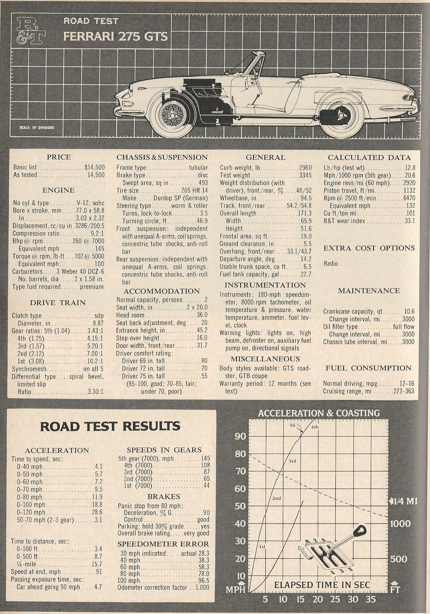 How grateful I am that you posted the data panel for the 275GTS! I remember that in 1966 we were all blown away that one could get 90% of the Tom Tjaarda style of the GTB in a Fiat 124 Spider for about a third of the price. Of course you also got a third of the performance. My favorite comparison is the fire-breathing 1965 Shelby GT350 against the current Mustang four cylinder Ecoboost. The four makes four more horsepower, and it’s net, not gross!