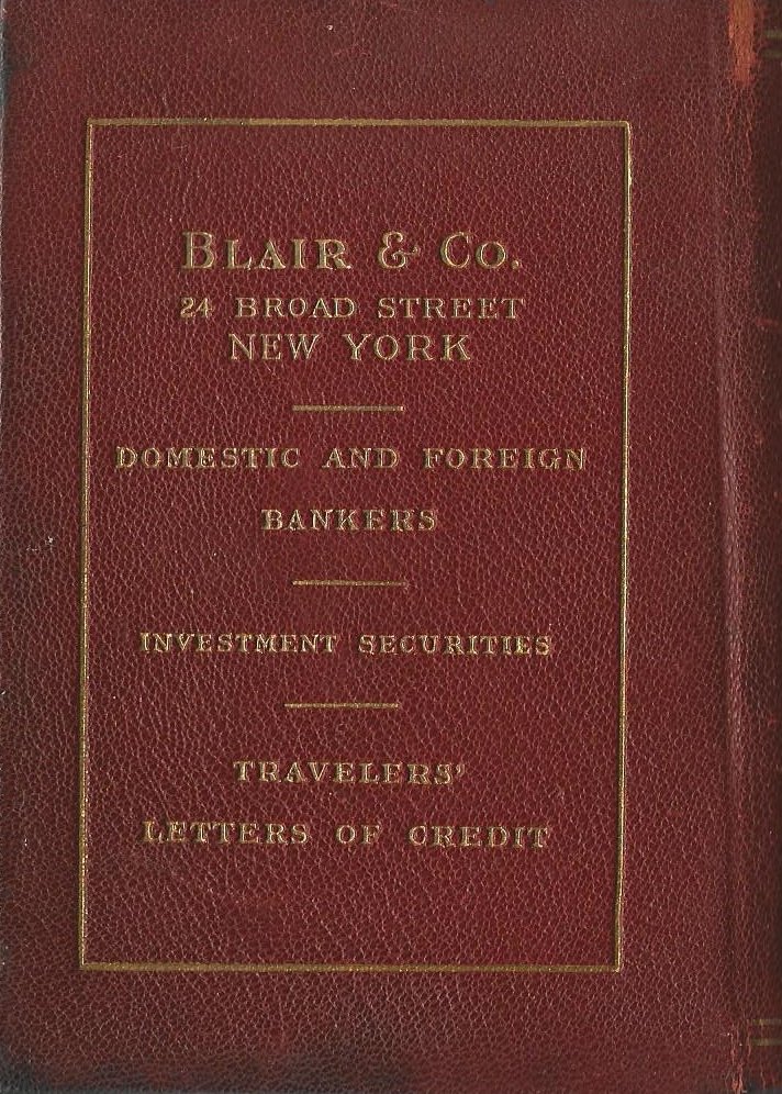 Blair & Co. were bankers back in the days when Wall Street offered complimentary little guidebooks, not dodgy hedge funds, for example. The Biographical Directory of the State of New York, 1900, lists Clinton Ledyard Blair, Princeton ’90, and De Witt C. Blair, Princeton ’56, at 33 Wall Street. Full disclosure: I didn’t get the book free from them; I bought it for $7.50 here in southern California at a secondhand bookshop.