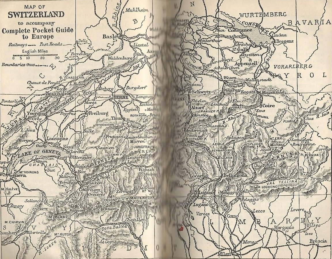 Driving in Switzerland is given rather more explanation: “Each car must carry a white and a green light in front and a red light behind, a good horn, and two brakes, each one capable of stopping the car within two metres (33 feet) [the authors mean ten metres] on a decline or when running at full legal speed.”