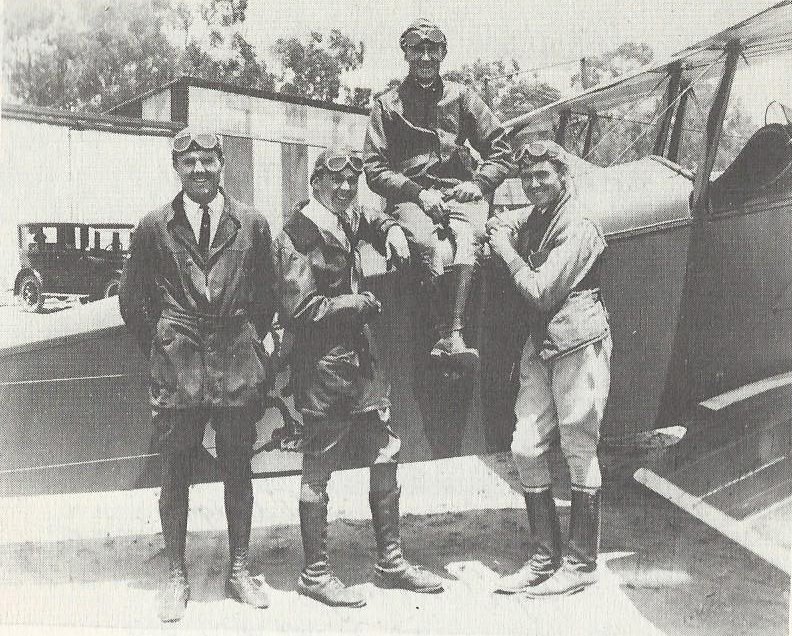 The Flying Montees. From left to right, Brothers Harold and Ralph, their father J.W. and, first into the air, brother Kenneth. This and other images from Los Angeles Aeronautics 1920-1929, compiled by D.D. Hatfield, American Hall of Aviation History, Northrop University, 1973.