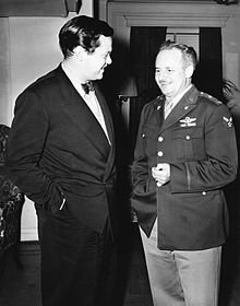 Welles and Col. Arthur I. Ennis, head of the public relations branch of the U.S. Army Air Forces, discuss Ceiling Unlimited radio series, 1942.