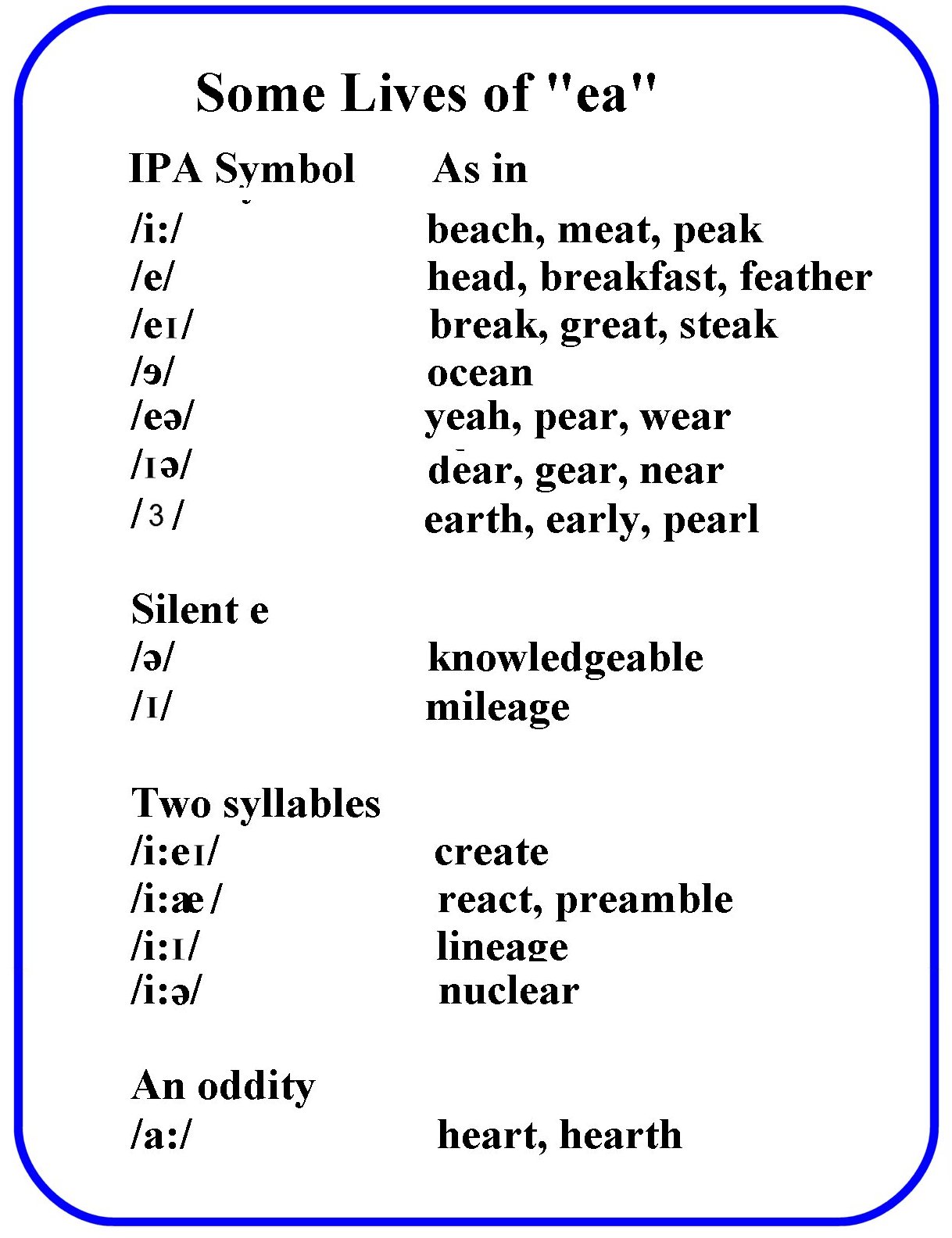 Teflpedia offers pronunciation exercises on “ea,” based on vowels of the International Phonetic Alphabet. The IPA allows English to be expressed in General American and nine others: Australian, Canadian, Indian, Irish, New Zealand, United Kingdom, Scottish, Singapore and Welsh.