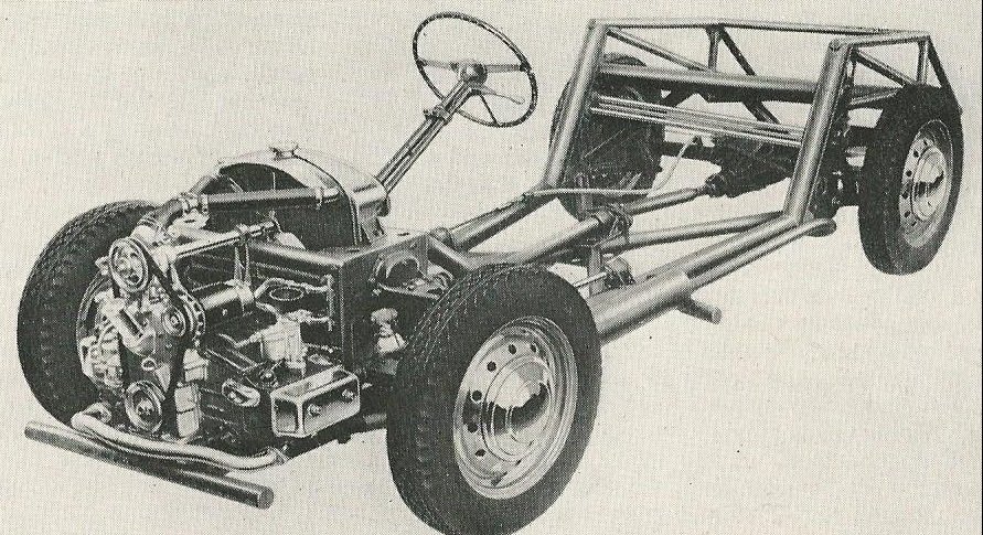 The Jupiter chassis, designed by Robert Eberan von Eberhorst. Noteworthy are its cruciform bracing and the low-mounted flat four ahead of the radiator.