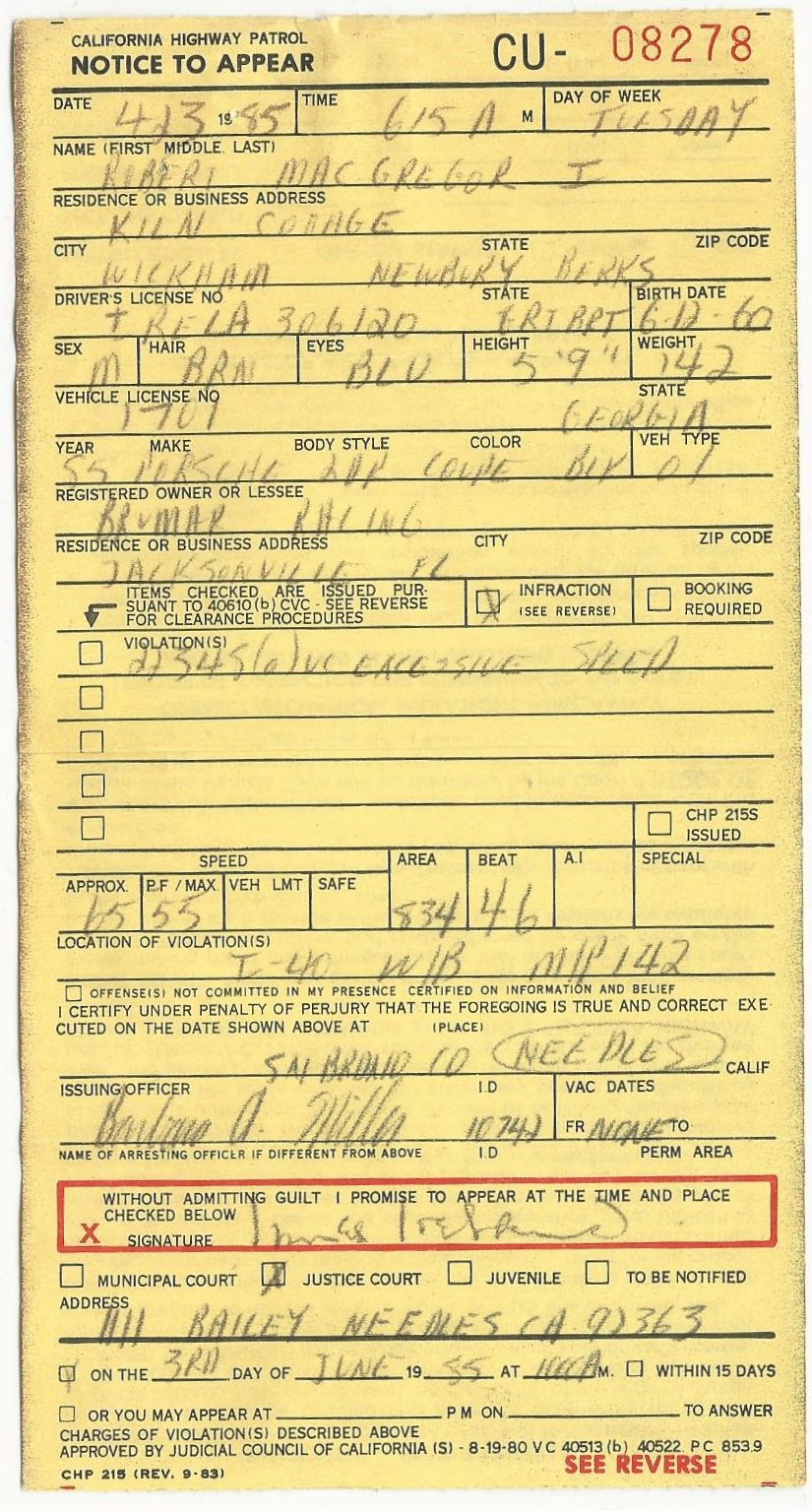 I got what details he remembered—Needles, Brumos Racing Porsche, speeding, the best looking woman he’d seen for a month. I phoned the Needles Justice Court and shared at least part of this information. A kind and understanding Deputy Clerk took a while to discover that indeed there was an outstanding speeding citation for “Robert MacGregor I” living in Kiln Cottage, Wickham, Newbury, Berks.