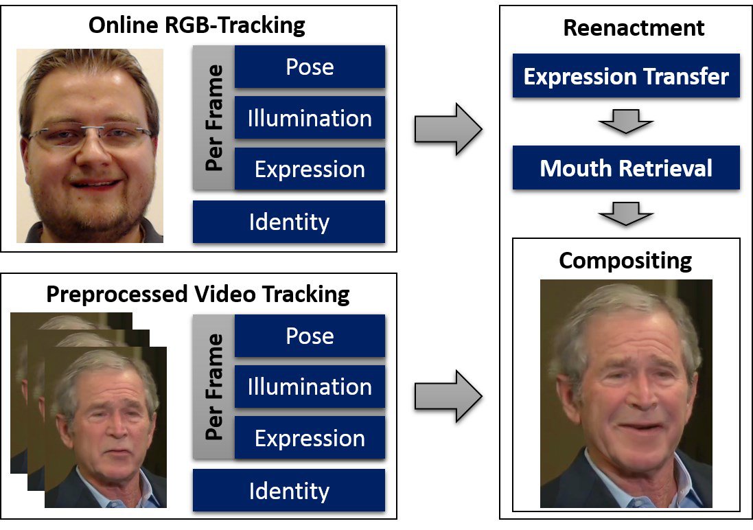 A video source can be digitized, allowing another to be rendered with a similar expression. This and other images from Face2Face.