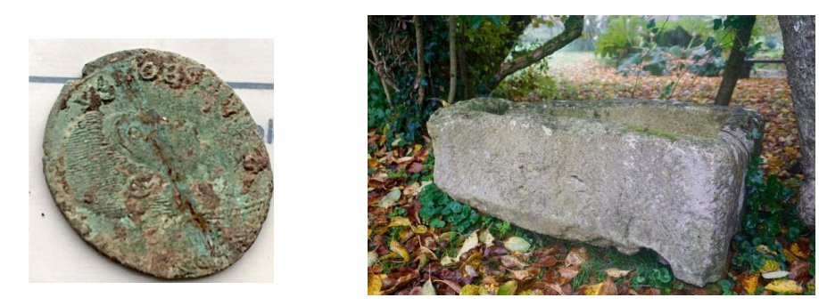 The coin was one of many unearthed at Deverill Villa. This stone box, more recently used as a flower pot, was actually a child’s coffin.