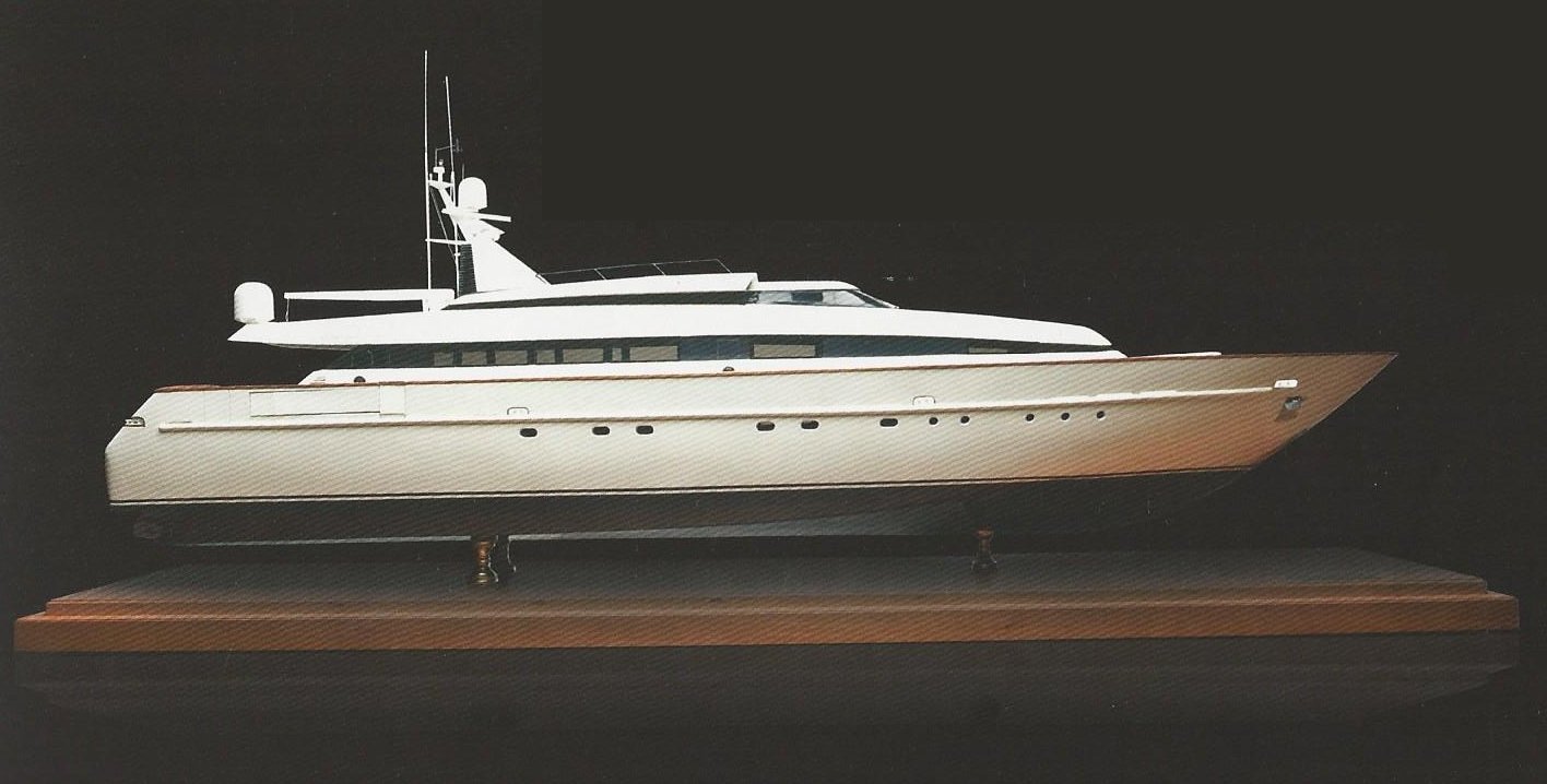 The full-size counterpart is a 154.2-ft. motor yacht, last refitted in 2010 and now rechristened the Lady Anastasia. She’s available these days for charter with details at yachtcharterfleet.com.