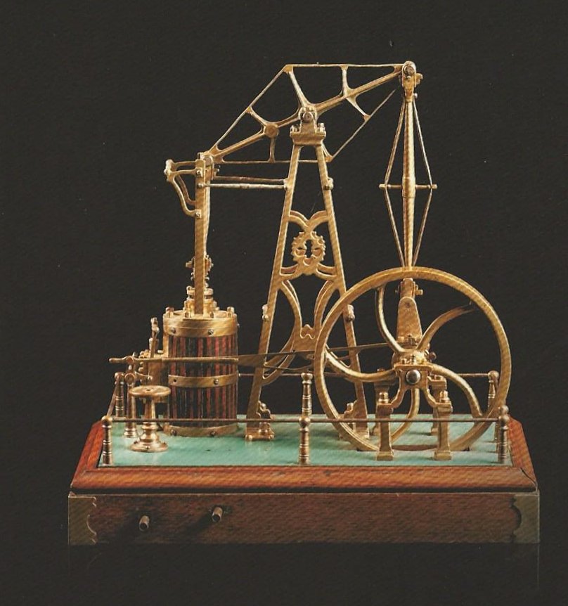 The catalog suggests that this engine may have been built by Thomas Meikle in 1880. It is believed to have powered a sewing machine of a Parisian cobbler.