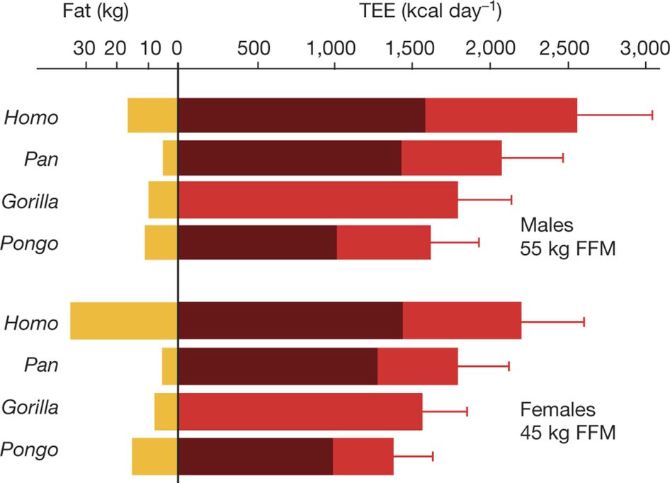 This new research is something of a Unified Field Theory of BMR and TEE: Compared with our ape relatives, humans burn considerably more calories per day, even when accounting for size and levels of activity. That is, human metabolism has evolved to support our greater brain size and other human characteristics.