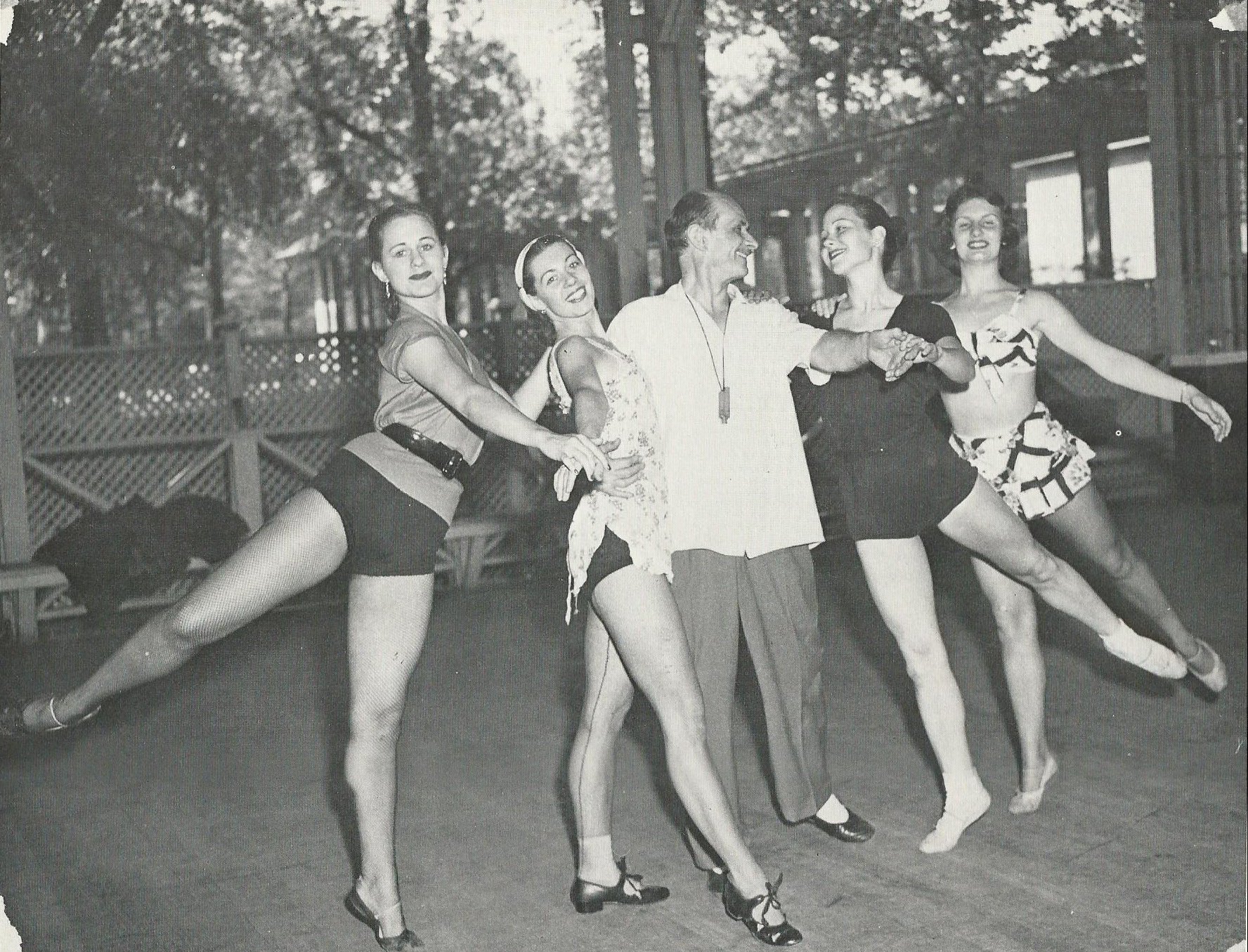 The Green Hornet rehearsing dancers at the St. Louis Municipal Opera, 1950.