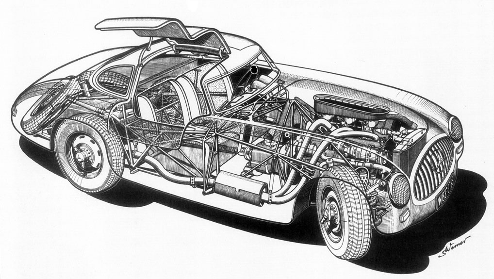 The W194’s lightweight spaceframe called for innovative gullwing doors. Image from tech-racingcars.wikidot.com.