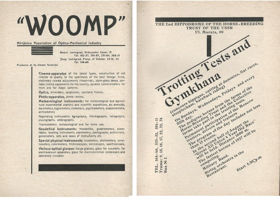 From the guide: Ads for the All-Union of Optico-Mechanical Industry and an upcoming horse show.