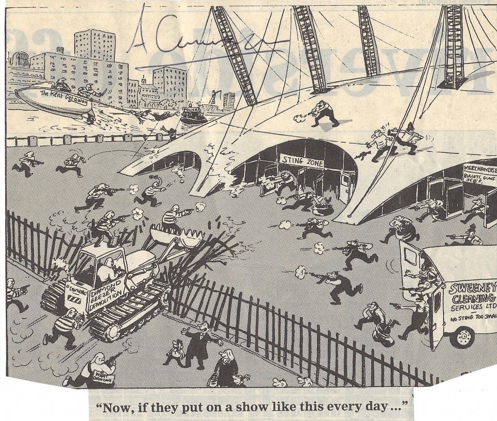 The Flying Squad and other police foiled an intricate plan to raid the Millennium Dome in 2000. Cartoon from earthmoversmagazine.co.uk originally published in the Evening Standard. The autograph is by Aldo Ciarrocchi, one of the culprits.