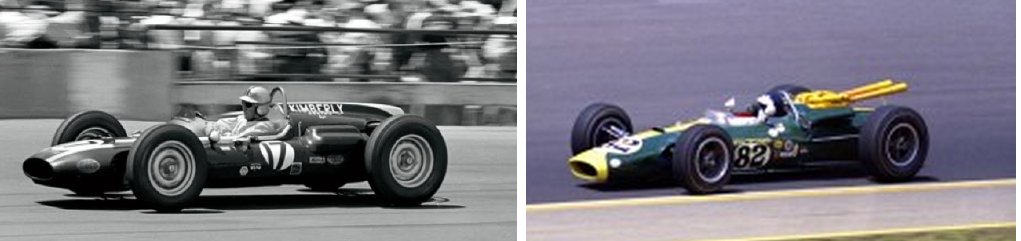 At left, Jack Brabham’s Cooper-Climax finished 9th in 1961 and got the Indy crowd thinking. At right, Jim Clark’s winning Lotus-Ford in 1965. These and other images from the Indianapolis Motor Speedway.